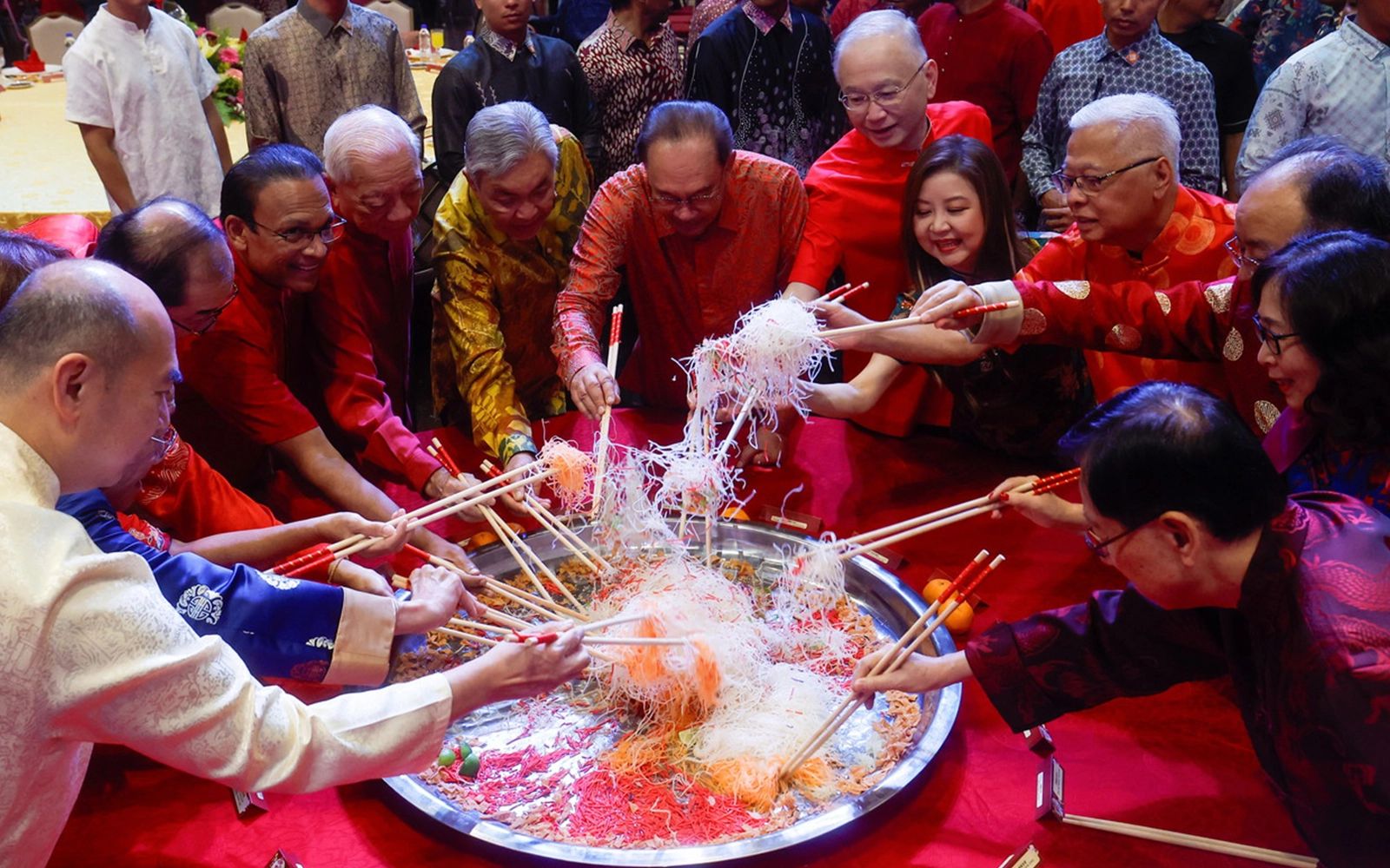 Pada majlis itu, Anwar bersama tetamu kehormat menggaul Yee Sang iaitu hidangan tradisional yang sinonim dengan sambutan Tahun Baharu Cina.