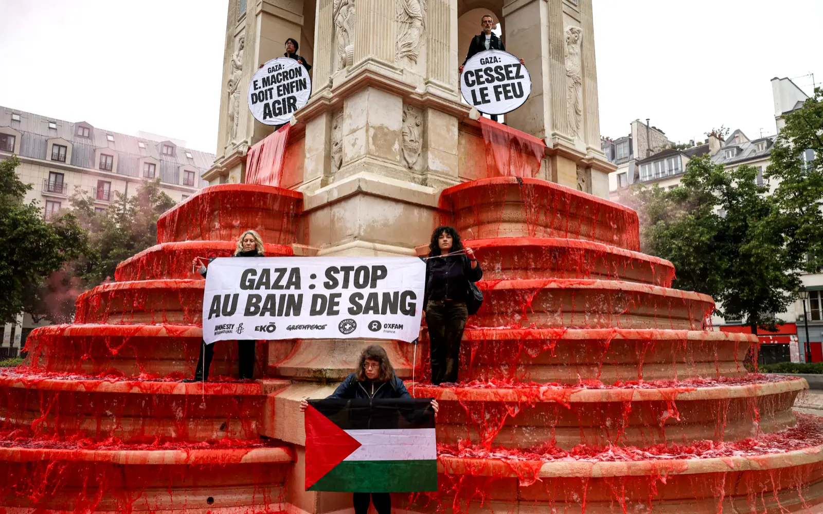 Activists turn Paris fountain red to denounce Gaza ‘bloodbath’