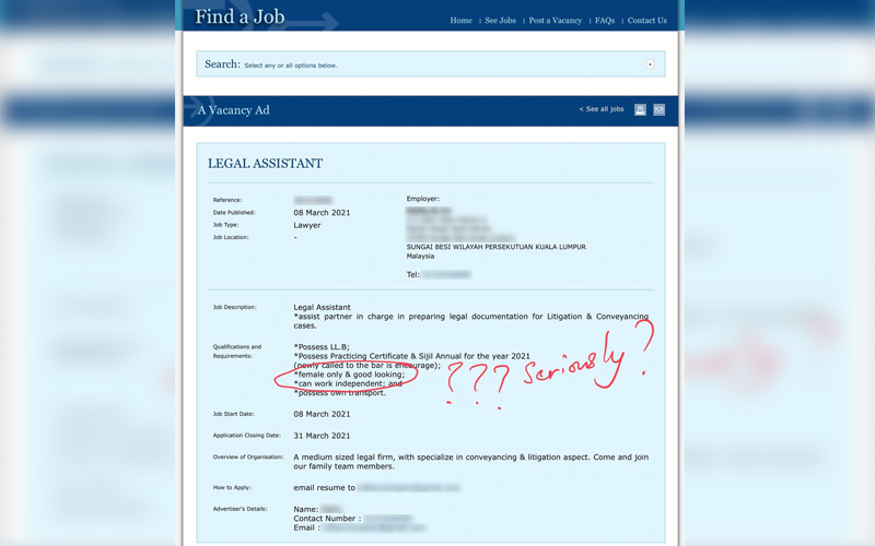Iklan cari pembantu undang-undang ‘wanita sahaja dan cantik’ tular di media sosial